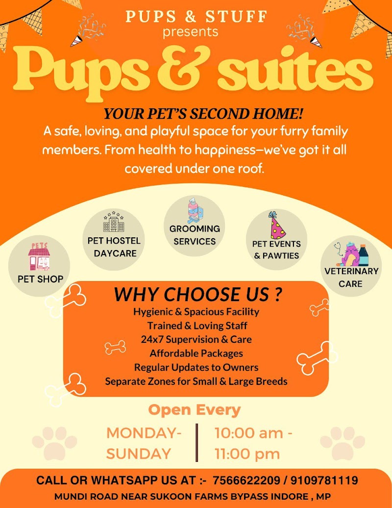 PUPS & SUITES is a trusted dog walking service in Indore, Indore, Madhya Pradesh. Rated 5★ from 2 reviews. They offer daily morning and evening walks, off-leash play sessions and pet sitting to pet owners across Indore. Finding a reliable dog walking service in Indore can be challenging, but PUPS & SUITES is known for quality care and customer satisfaction. Their team handles dogs, cats, birds and all types of pets with dedication. Located in Indore, they serve pet owners from across Indore and surrounding localities. Personalised services ensure the best experience for both pets and their owners. Contact them directly by phone or WhatsApp for availability, pricing and bookings. PetPros has verified this listing via Google Places — always call ahead to confirm timings.