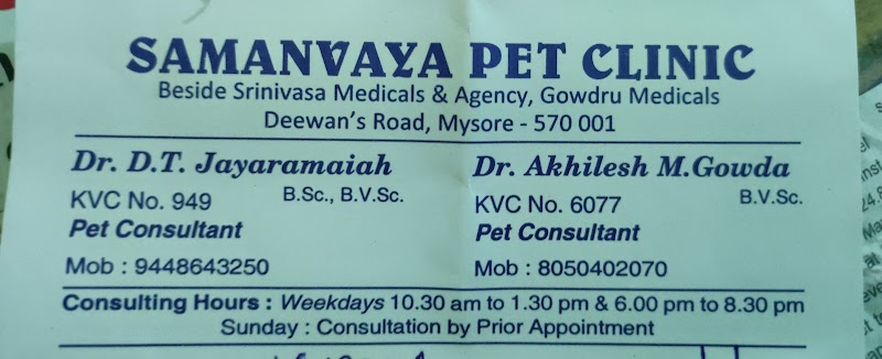 Samanvaya Pet Clinic is a trusted veterinary clinic in Shivarampet, Mysore, Karnataka. They offer health check-ups, vaccinations, surgical procedures, dental care and emergency treatment to pet owners across Mysore. Finding a reliable veterinary clinic in Mysore can be challenging, but Samanvaya Pet Clinic is known for quality care and customer satisfaction. Their team handles dogs, cats, birds and all types of pets with dedication. Located in Shivarampet, they serve pet owners from across Mysore and surrounding localities. Personalised services ensure the best experience for both pets and their owners. Contact them directly by phone or WhatsApp for availability, pricing and bookings. PetPros has verified this listing via Google Places — always call ahead to confirm timings.