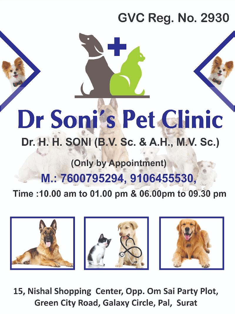 Dr soni's pet clinic is a trusted veterinary clinic in Adajan, Surat, Gujarat. Rated 4.3★ from 148 reviews. They offer health check-ups, vaccinations, surgical procedures, dental care and emergency treatment to pet owners across Surat. Finding a reliable veterinary clinic in Surat can be challenging, but Dr soni's pet clinic is known for quality care and customer satisfaction. Their team handles dogs, cats, birds and all types of pets with dedication. Located in Adajan, they serve pet owners from across Surat and surrounding localities. Personalised services ensure the best experience for both pets and their owners. Contact them directly by phone or WhatsApp for availability, pricing and bookings. PetPros has verified this listing via Google Places — always call ahead to confirm timings.